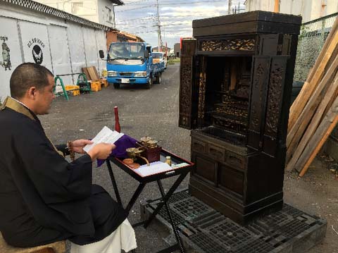 仏壇の撥遣供養(魂抜き)の様子。現場にて法要