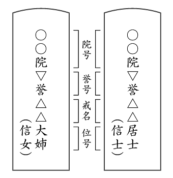 ・○○院○譽○○居士・大姉 あつい信仰を持った信者に贈られる。